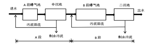 AB工藝是一種包括A段(吸附段)和B段(生物氧化段)的兩段活性污泥法,其工藝流程如下圖所示。此流程由A段曝氣池、中沉池、B段曝氣池和二沉池四部分組成。A段與B段的污泥回流互不影響,各自有各自的體系,相互獨立。為了使原污水中存在的微生物和有機物得以充分利用,A段之前一般不設初沉池,保障系統高效穩定地運行。在實際工程中,AB工藝是一種處理系統,它由城市排水管網和污水處理廠構成,因此AB工藝前不設置初沉池。HDF11cOM